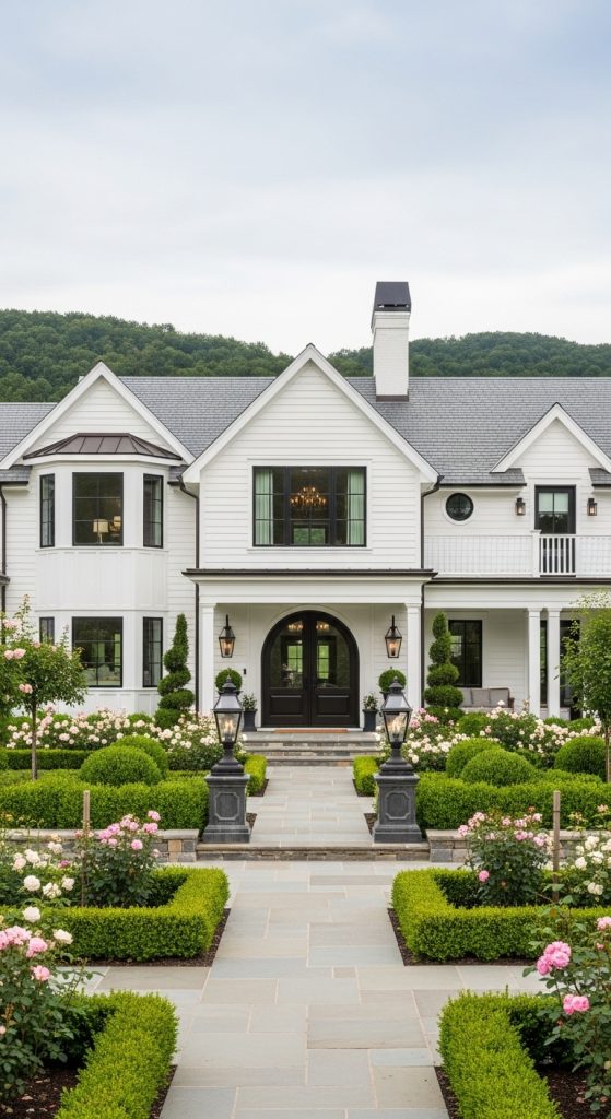 This farmhouse idea is big, elegant, and perfect for advanced builders. It combines luxury with countryside charm.