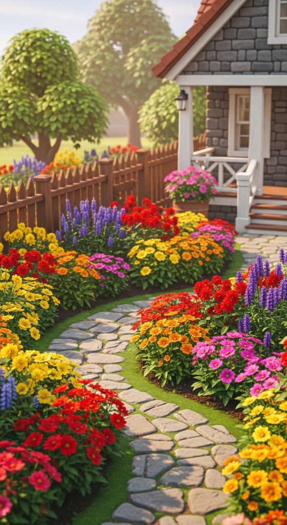 A cozy cottage flower garden is one of the most charming 10 Bloxburg Garden Ideas. It feels soft, colorful, and peaceful, like a fairytale backyard. This garden is filled with flowers, small bushes, and simple pathways that make everything feel warm and natural.