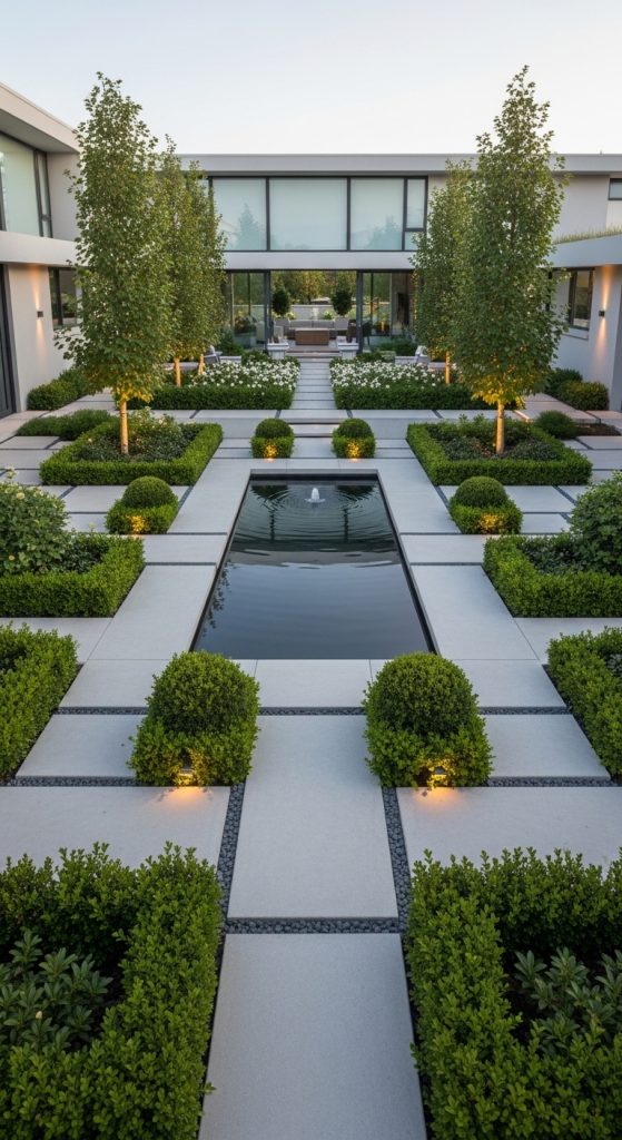 This garden is clean, simple, and very stylish. It focuses on straight lines, symmetry, and a calm green environment.