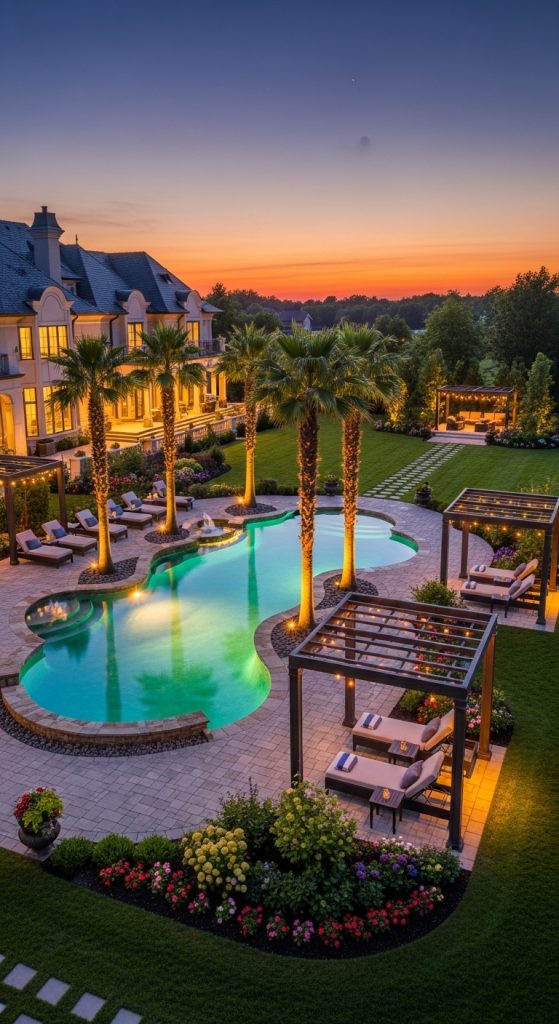 This is one of the most popular Bloxburg Garden Ideas because it looks expensive and stylish. It combines a garden with a luxury pool area.