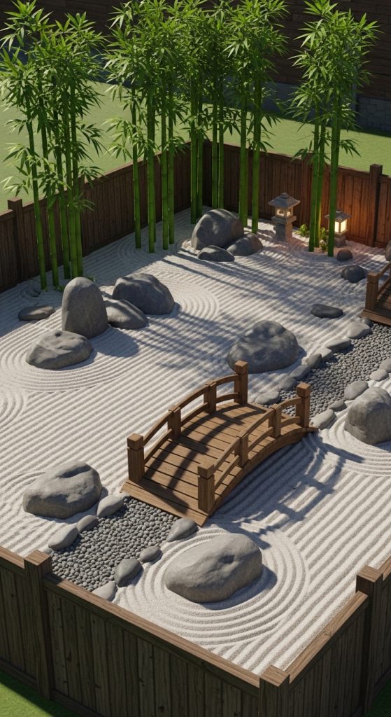 A Japanese Zen garden is calm, peaceful, and minimal. It focuses on balance, nature, and simplicity.