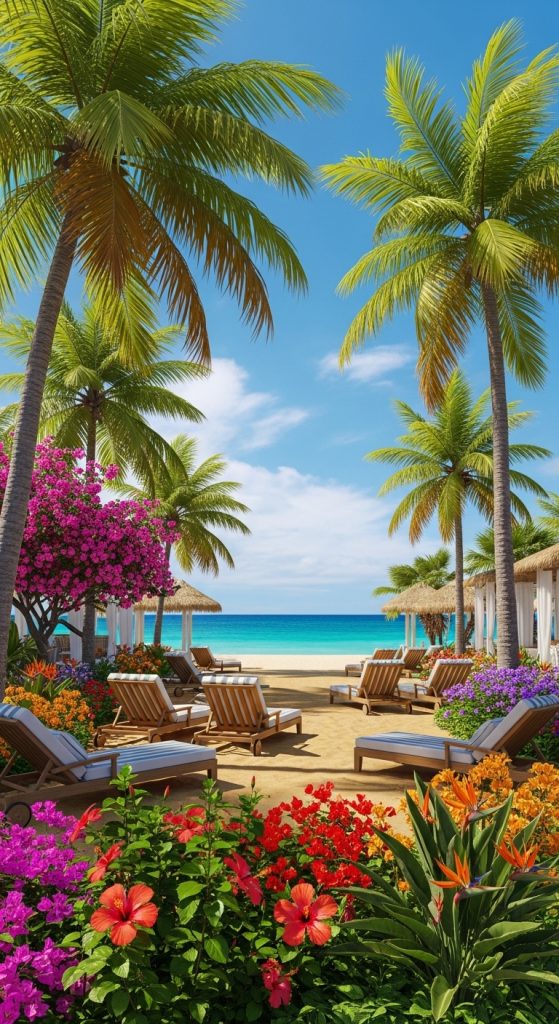 This garden feels like a vacation spot. It’s full of palm trees, bright colors, and relaxing vibes.