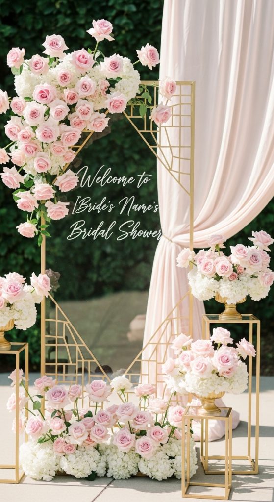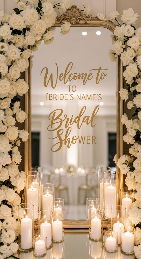 A mirror welcome sign adds instant glamour. It reflects light and makes your space look bigger and brighter. This idea is perfect for elegant indoor bridal showers.