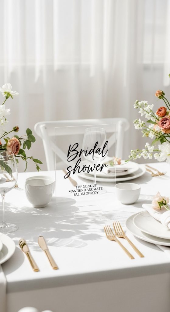 Acrylic signs with soft floral designs are a top trend in bridal showers. They look modern, classy, and expensive—even if they are DIY. You can place them at the entrance with fresh or artificial flowers around them. This idea works well for garden, garden party, or luxury-themed showers.