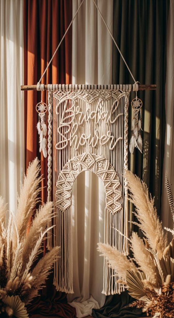 A boho macramé sign is perfect for relaxed, earthy bridal showers. It gives a handmade, artistic feel that guests love.