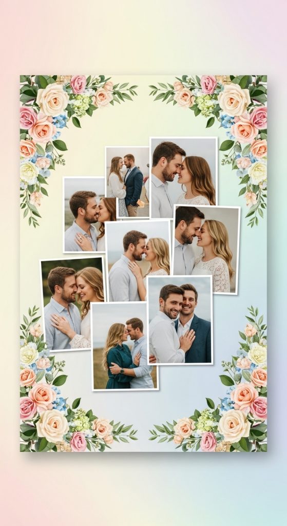 A photo collage welcome sign is emotional and personal. It shows the couple’s journey and makes guests feel connected.
