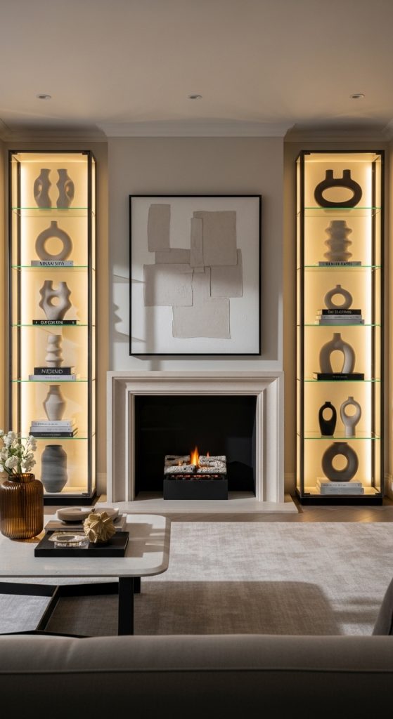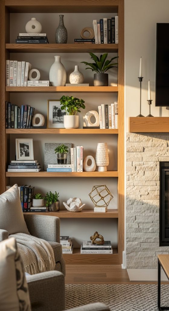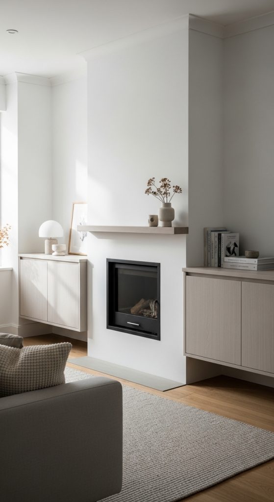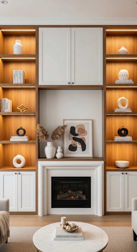 Open shelves keep the space light and stylish. This idea in 10 Cabinets Beside Fireplace Ideas is perfect for displaying books and décor.
