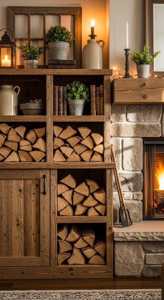 This rustic idea adds charm and function to your fireplace area. It is one of the most practical 10 Cabinets Beside Fireplace Ideas.