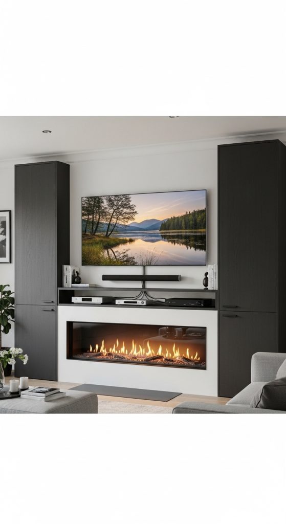 This modern design combines fireplace and TV setup with side cabinets. It is a smart idea in 10 Cabinets Beside Fireplace Ideas.