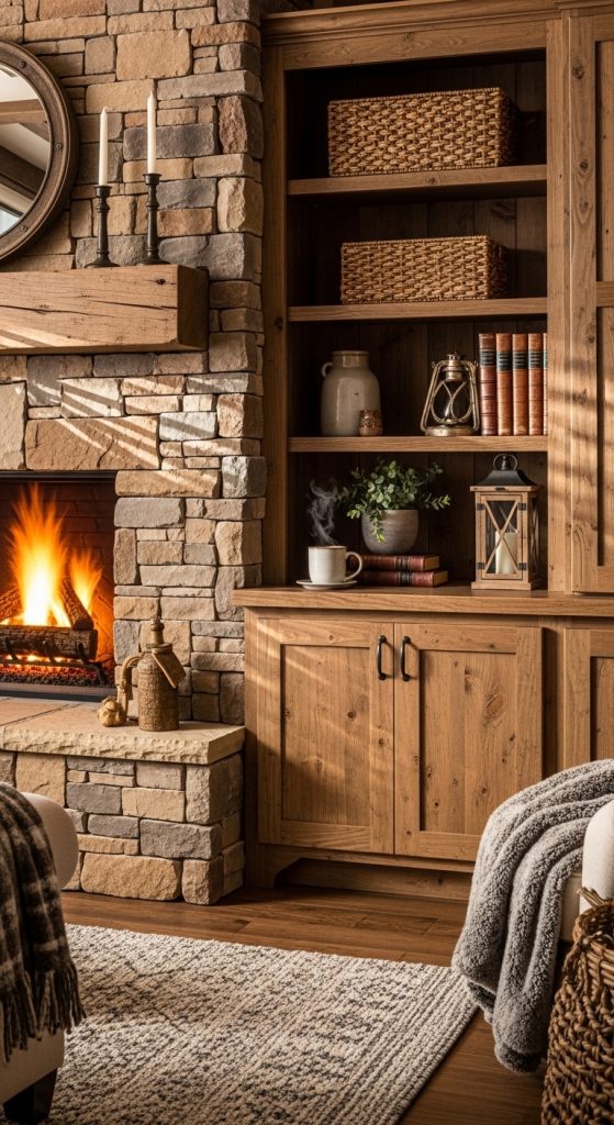 9. Rustic Wooden Cabinets Beside Fireplace