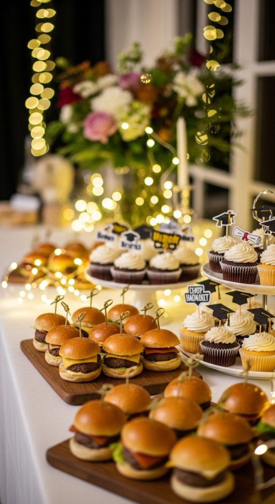 Mini sliders are one of the most popular 10 Easy Graduation Party Food Ideas because they are tasty, filling, and easy to hold. Guests love them because they can grab and eat without needing plates or forks. You can make beef, chicken, or veggie sliders depending on your guests’ preferences.