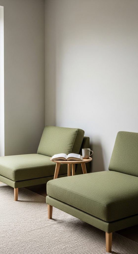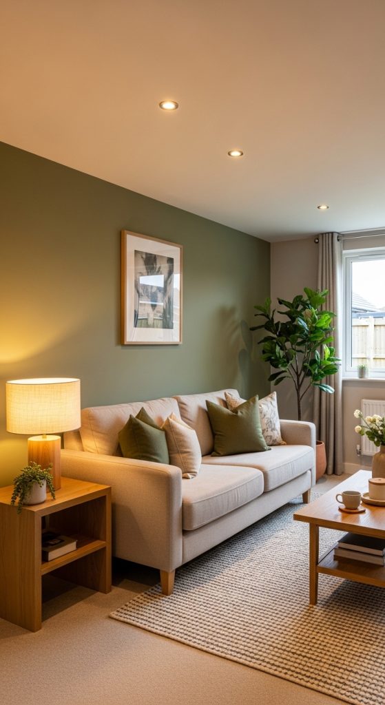 Using an olive green accent wall adds depth and warmth to your lounge. It pairs beautifully with neutral furniture and wooden textures.