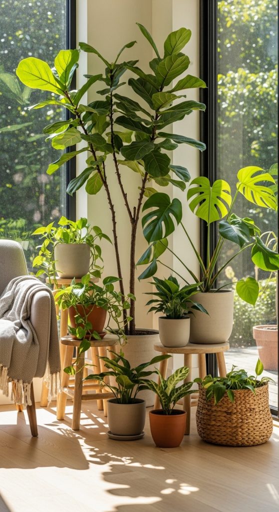 Bringing in indoor plants adds life, purifies the air, and creates a natural green vibe. From tall leafy plants to small potted herbs, they are versatile additions.