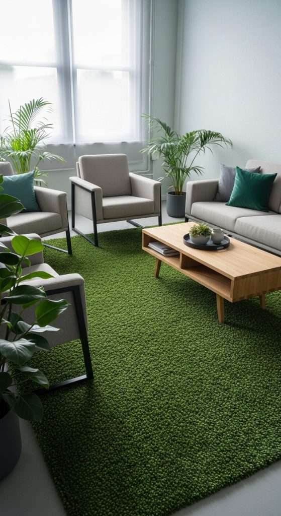 Why it works: Rugs define seating areas and infuse green without committing to walls or large furniture.