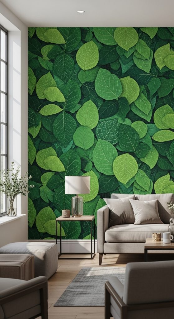 Why it works: Wallpaper adds texture and visual interest while reinforcing a natural, green theme.