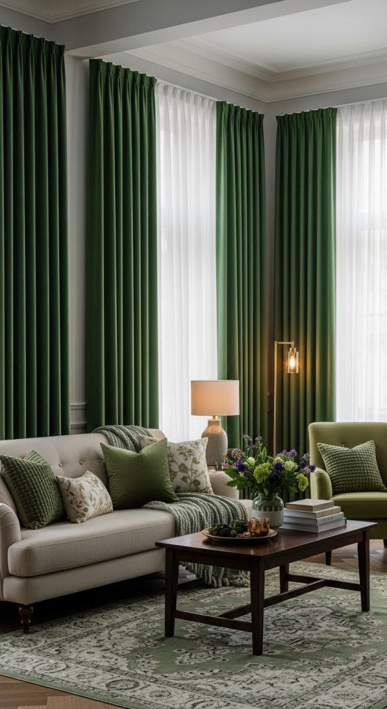 Why it works: Curtains frame windows, add warmth, and create a cohesive green-inspired space.