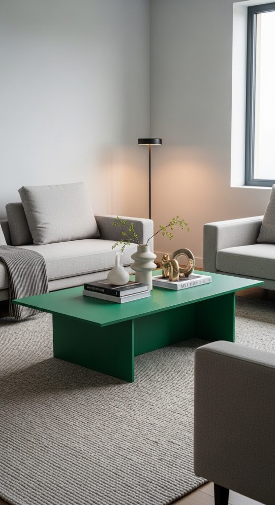 Adding green furniture pieces like coffee tables or side tables can be a bold yet stylish choice. It introduces color without dominating the room.