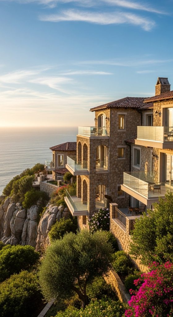 This Mediterranean house idea is inspired by homes built on cliffs overlooking the ocean. It feels dramatic, peaceful, and luxurious.