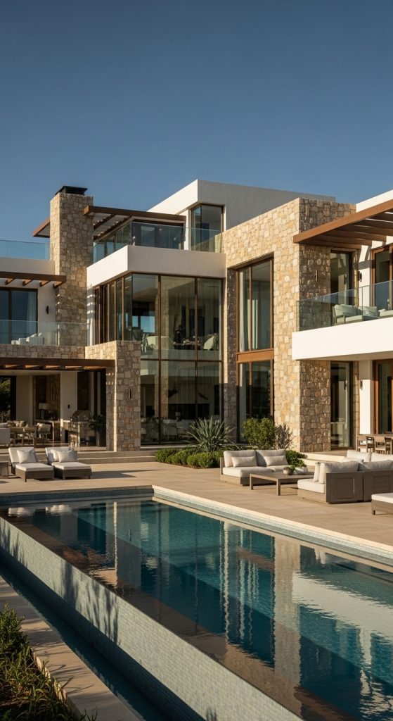 This design combines modern luxury with Mediterranean charm. It’s sleek, spacious, and perfect for big Bloxburg builds.