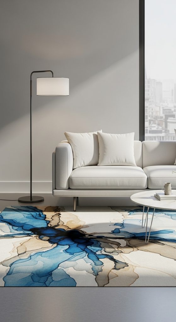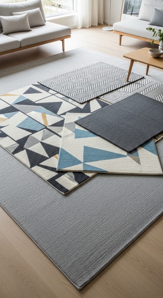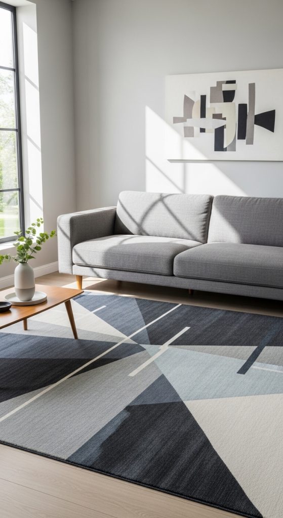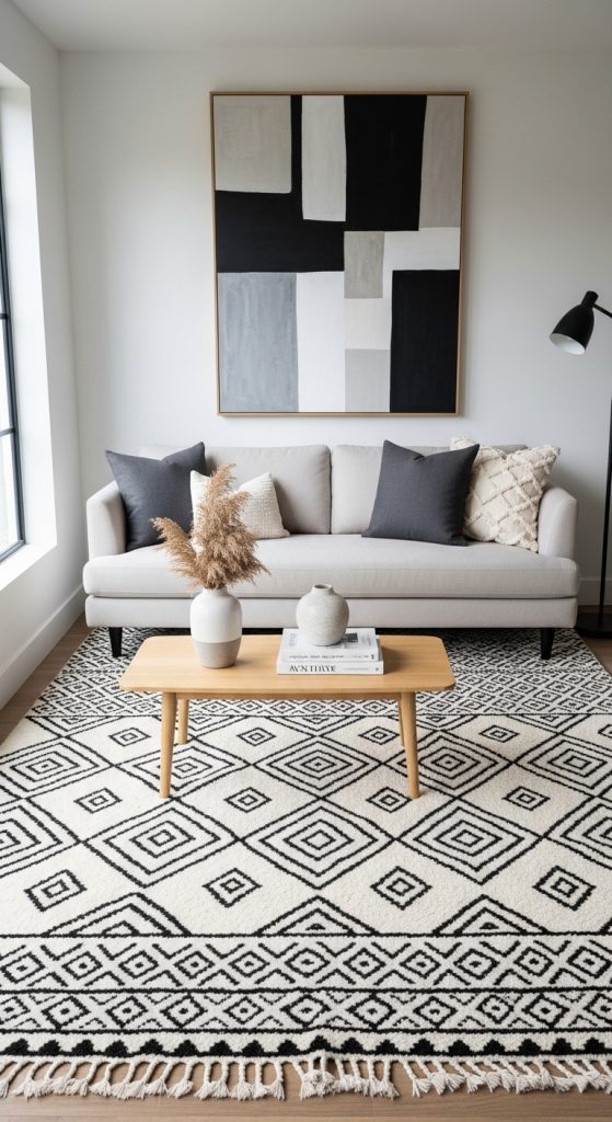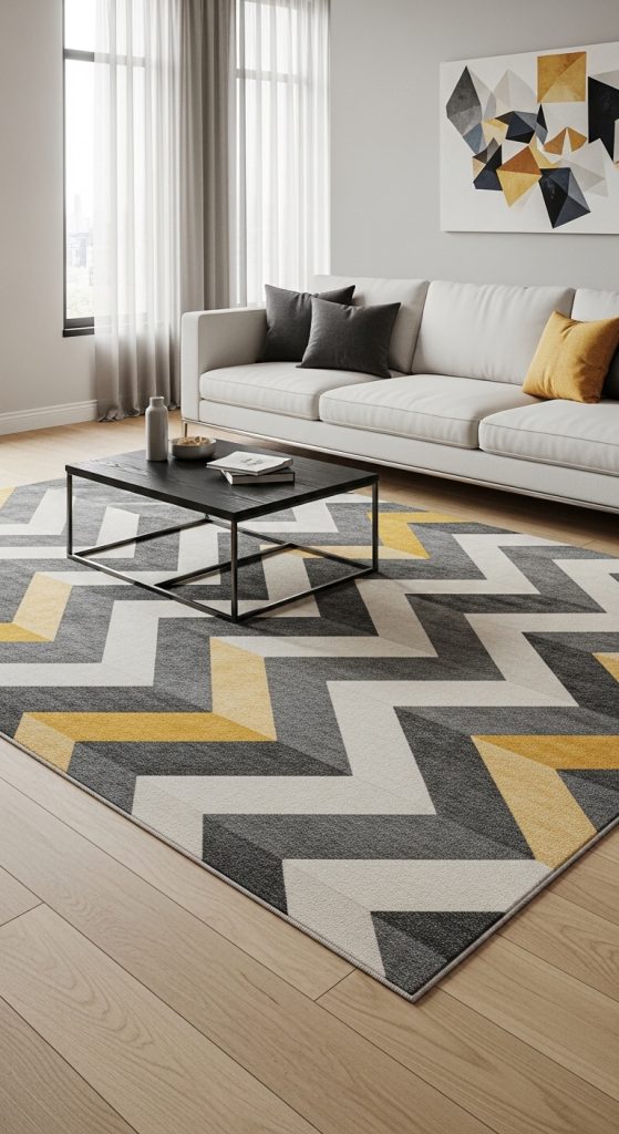 Patterned rugs with modern motifs—stripes, chevrons, or abstract prints—add energy and sophistication.