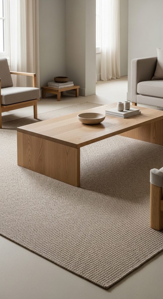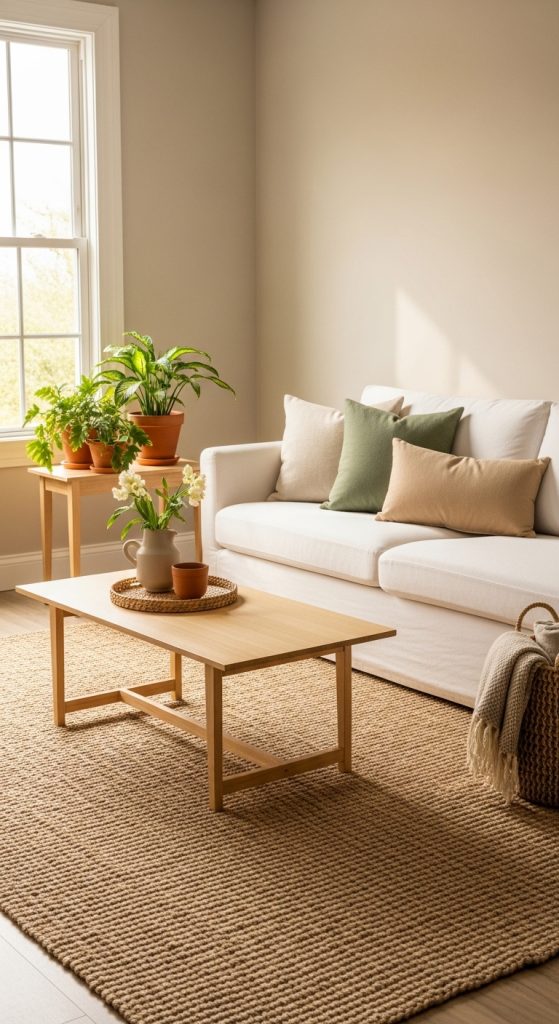 Why it works: Natural fiber rugs combine style, sustainability, and easy maintenance.