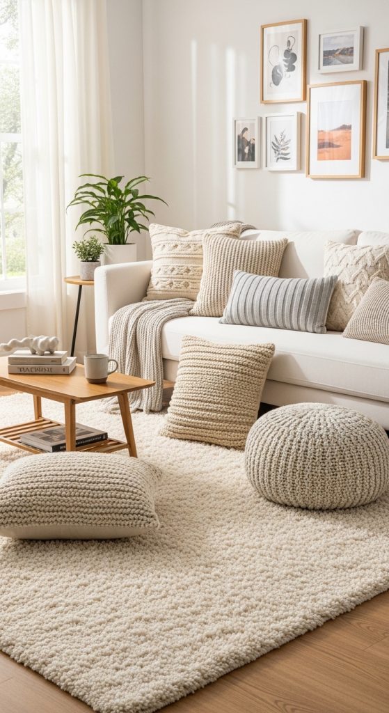 Why it works: Textured rugs add warmth, depth, and a sensory experience to modern living rooms.