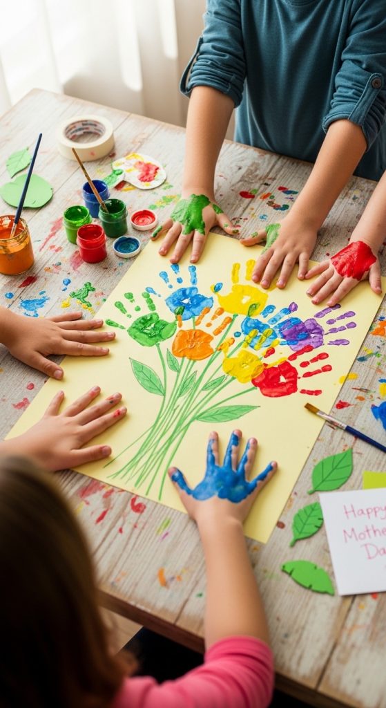 A handprint flower bouquet is one of the cutest 10 Mother’s Day Crafts For Kids Ideas. It turns a child’s handprint into beautiful flowers that moms can keep forever.