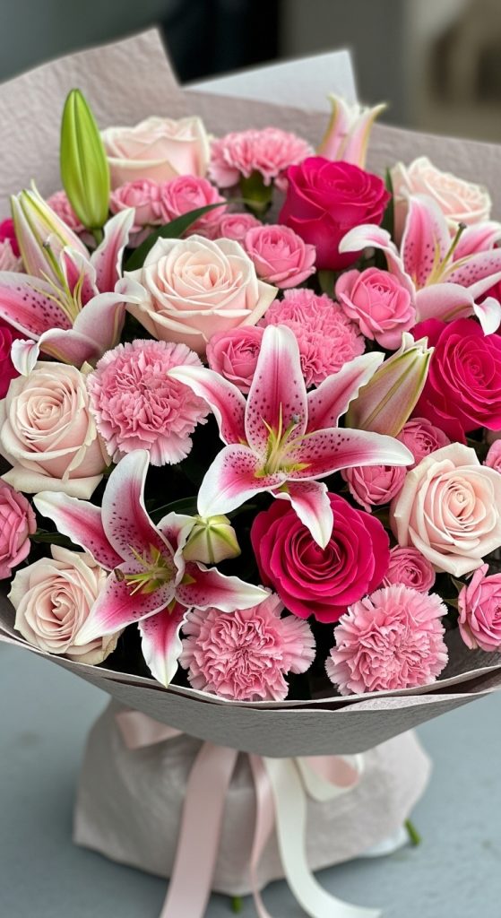 A mixed pink flower bouquet combines different flowers like roses, lilies, carnations, and daisies. This creates a rich, textured, and luxurious arrangement. It is perfect for big celebrations or high-end gifts.