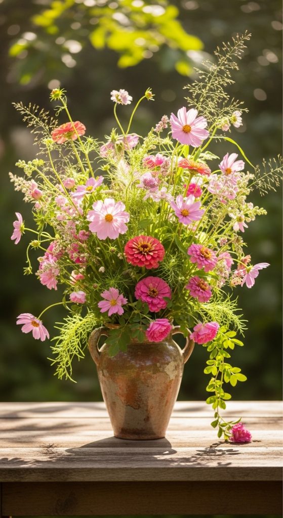 A wild garden bouquet looks natural, free-flowing, and slightly messy in a beautiful way. It feels like flowers picked from a garden and arranged casually. This style is very trendy in Pinterest aesthetics.