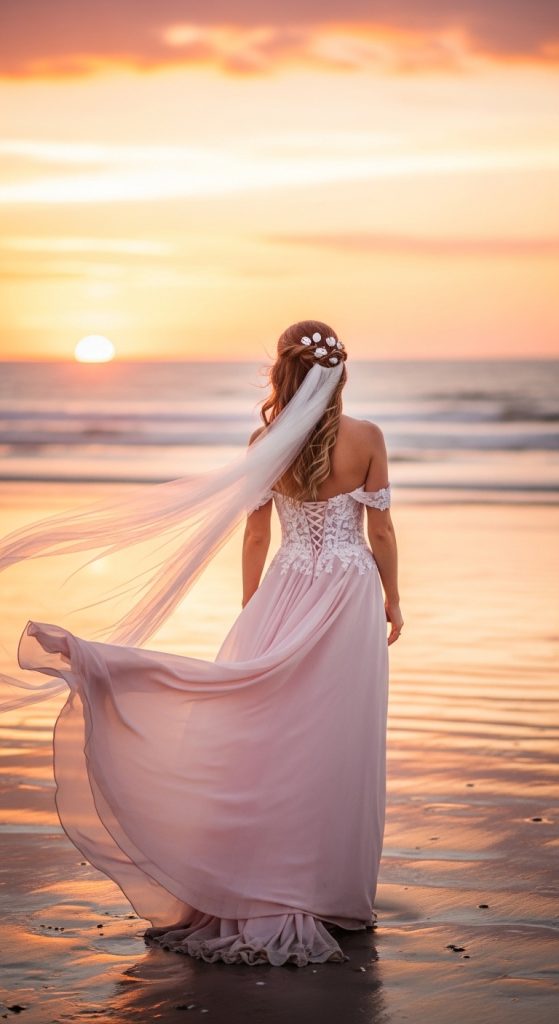 A pink boho wedding dress is relaxed, natural, and free-spirited. It often includes flowy fabrics, lace details, and earthy tones. This style is perfect for beach or outdoor weddings.