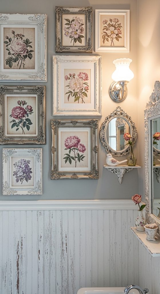 Wall art completes 10 Shabby Chic Bathroom Decor Ideas. Vintage prints, floral paintings, or old-style quotes make your bathroom feel personal and stylish.