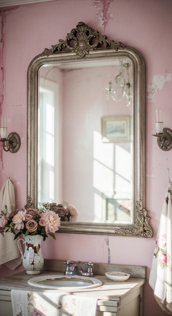 Mirrors are a key part of 10 Shabby Chic Bathroom Decor Ideas, especially when they have antique-style frames. A distressed white, gold, or wooden frame adds instant charm and elegance.