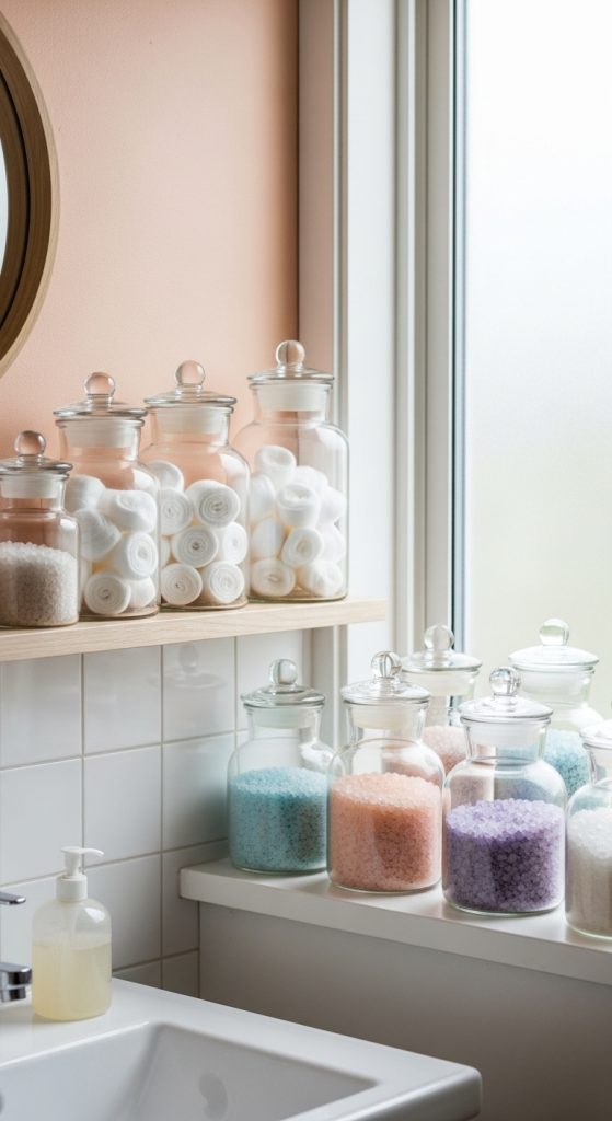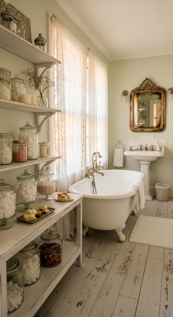Glass jars are both functional and decorative in 10 Shabby Chic Bathroom Decor Ideas. They help organize cotton balls, soaps, and bath salts while adding a vintage apothecary feel.