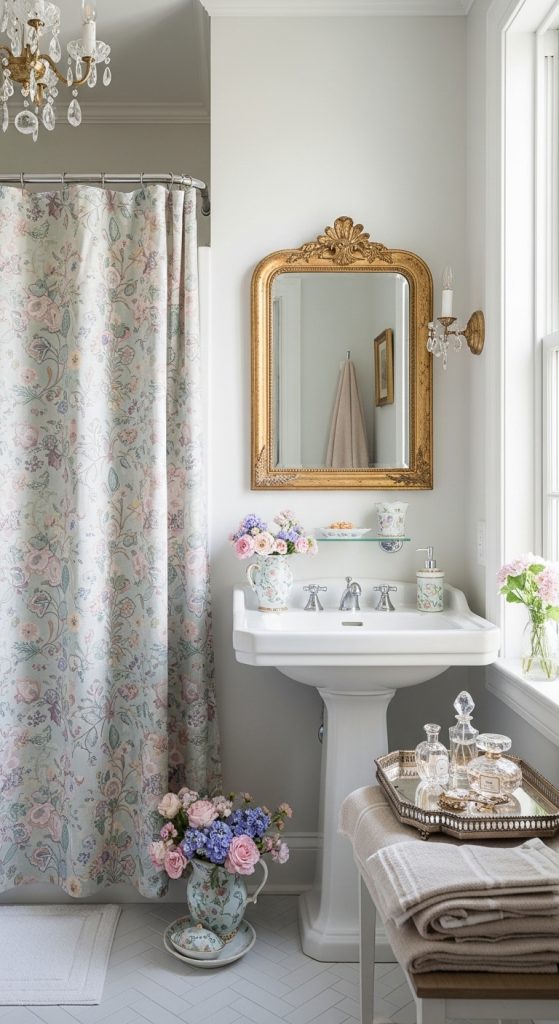 Floral patterns and lace are essential in 10 Shabby Chic Bathroom Decor Ideas. They bring softness and romance to the space. You can use floral shower curtains, lace window covers, or even fabric storage baskets.