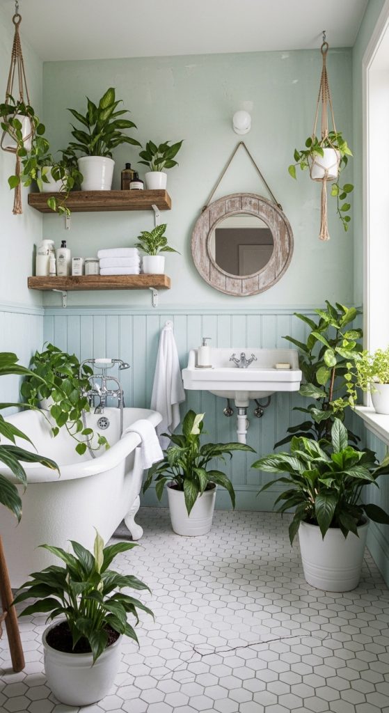 Plants bring life into 10 Shabby Chic Bathroom Decor Ideas. Small green plants or soft flowers add freshness and natural beauty. They also balance the vintage decor with a touch of nature.