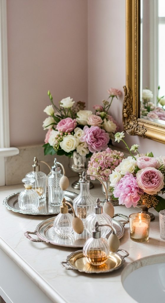 Antique-style accessories are a must in 10 Shabby Chic Bathroom Decor Ideas. Items like old perfume bottles, vintage trays, and ceramic soap dishes add character and personality.