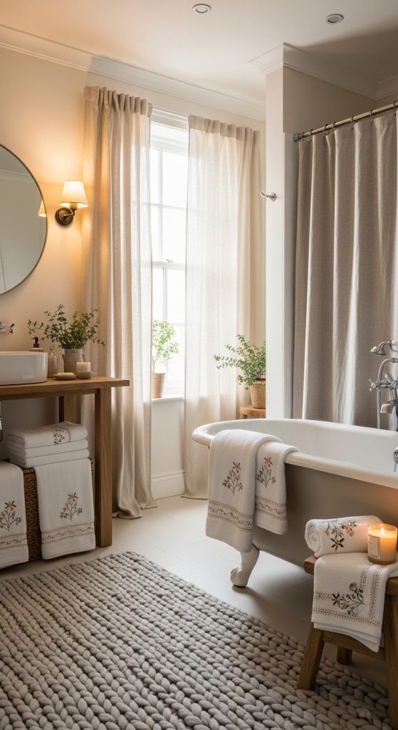 Textiles are very important in 10 Shabby Chic Bathroom Decor Ideas. Soft towels, knitted rugs, and linen curtains create a warm and inviting space. These fabrics add comfort and texture.
