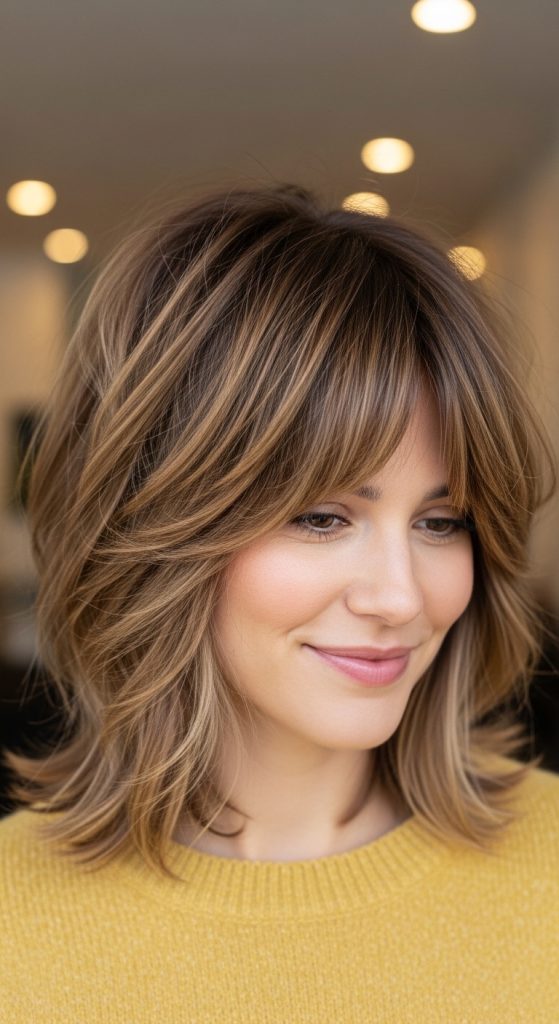 A layered crop with bangs frames the face beautifully, adding softness and dimension. It’s versatile and works with straight, wavy, or curly hair.