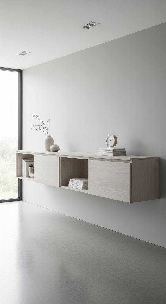 Wall shelves keep items off the floor and make rooms look bigger.