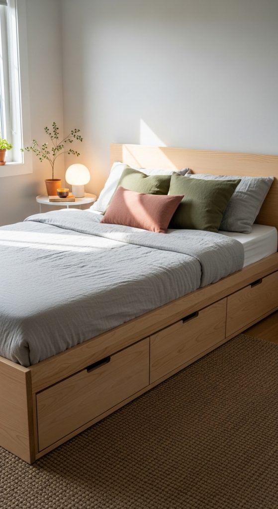 A storage bed is one of the best space-saving solutions. It uses the empty space under the bed for storage.