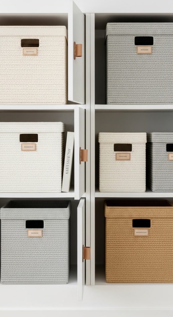 Mix décor items with storage boxes.