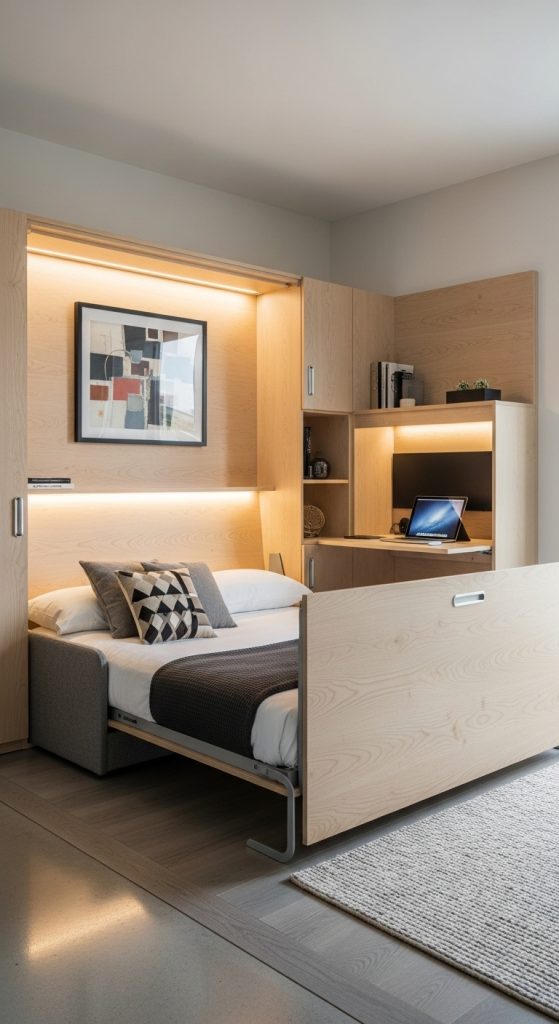 A Murphy bed folds into the wall when not in use, freeing up huge floor space.
