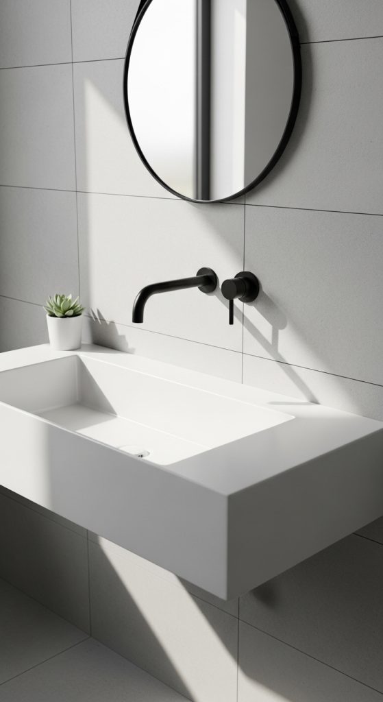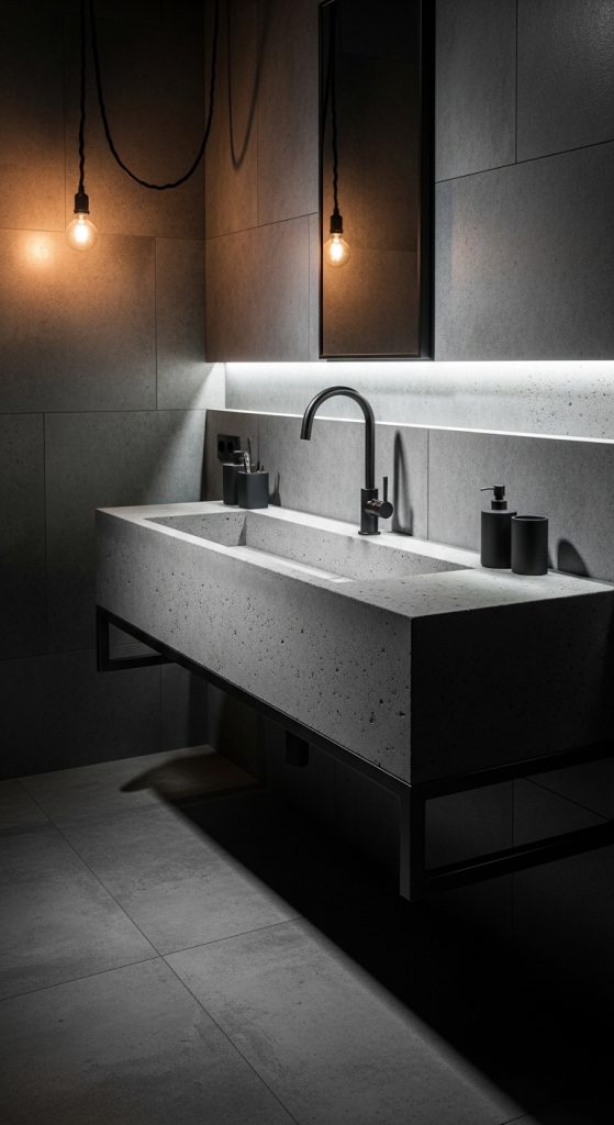 Concrete sinks are strong, modern, and stylish. This idea is a key part of 10 Trough Bathroom Sink Ideas for industrial-style bathrooms. The raw texture adds character and durability.