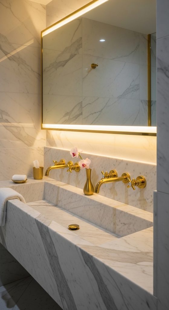 A marble trough sink adds luxury and elegance to any bathroom. It is one of the most premium 10 Trough Bathroom Sink Ideas and instantly upgrades the space.