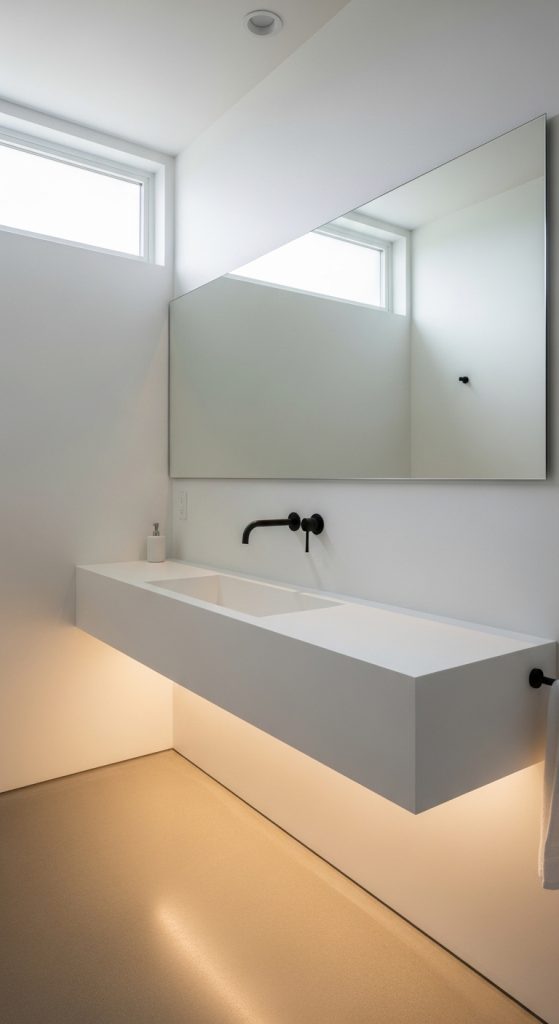 Floating sinks are modern and space-saving. This idea in 10 Trough Bathroom Sink Ideas keeps the floor open, making the bathroom look larger.