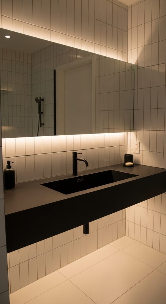 Black matte sinks are bold and stylish. They are a trending option in 10 Trough Bathroom Sink Ideas for modern homes. The dark finish adds contrast and elegance.