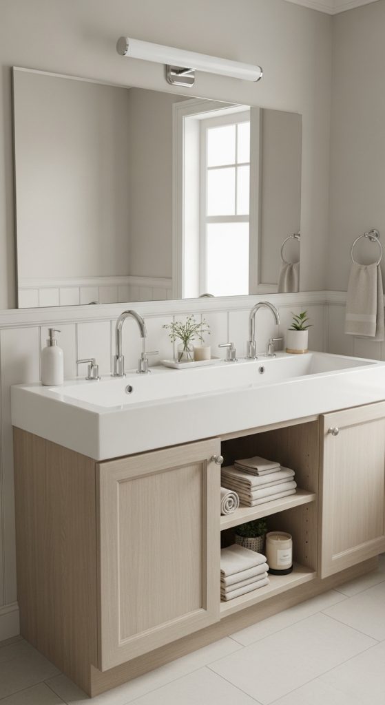 This design is one of the most practical 10 Trough Bathroom Sink Ideas. It includes two faucets on a single long sink, making it perfect for busy mornings in family bathrooms.