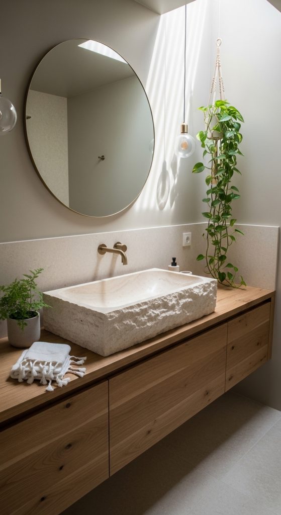 Natural stone sinks are artistic and unique. This idea is part of 10 Trough Bathroom Sink Ideas that focus on organic design. Each piece is one-of-a-kind.