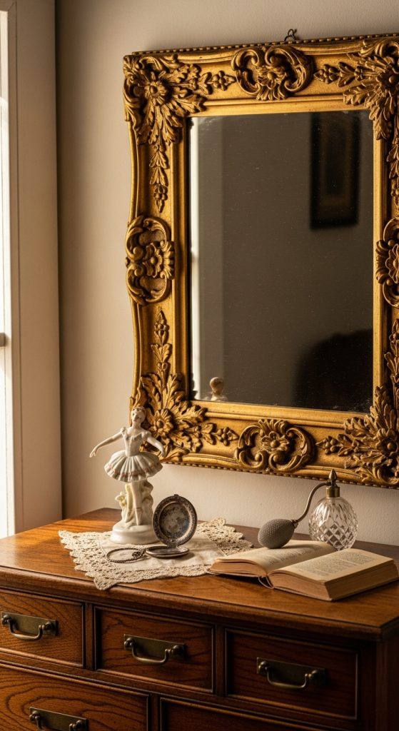 Decorative mirrors with ornate or distressed frames add elegance and depth to any vintage room.