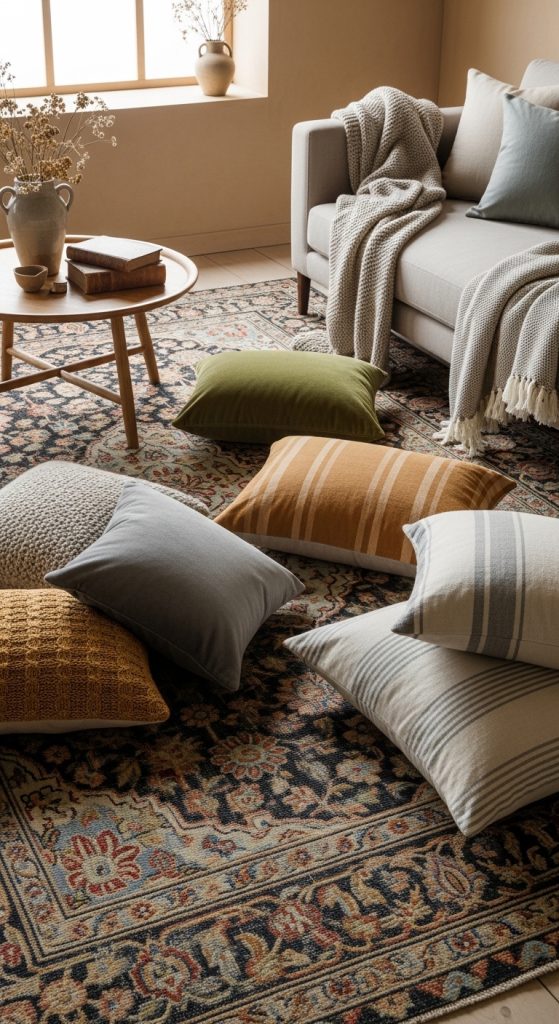 2. Add throws, cushions, or tapestries with muted tones.